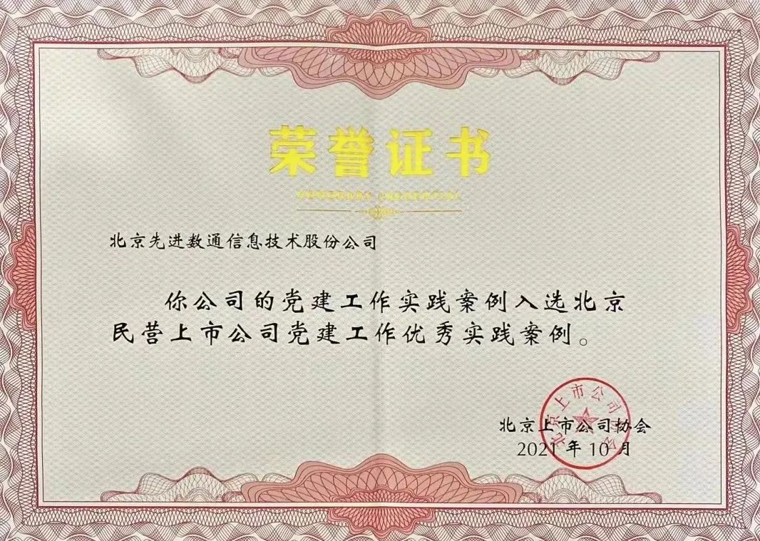 近期,北京上市公司协会授予北京顺发配资信息技术股份公司荣誉证书,顺发配资党建工作实践入选北京民营上市公司党建工作优秀实践案例,相关党建活动已收录在《北京民营上市公司党建工作优秀实践案例汇编》。